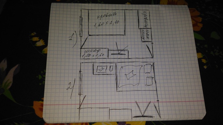На плане клетка 20 см. Шкаф нарисовала шириной 150, пеленальный комодик не знаю размеров, на плане 80-90 см. В первом варианте кроватку можно поставить повдоль, как взрослая. Шкаф при любых вариантах, как мне кажется, лучше ставить под балконную дверь, иначе там такой бесполезный участок будет, только для шкафа и сгодится.