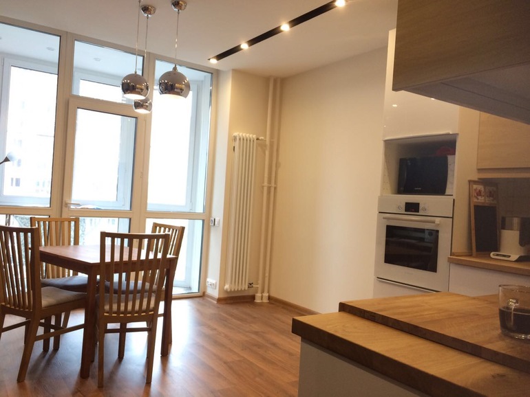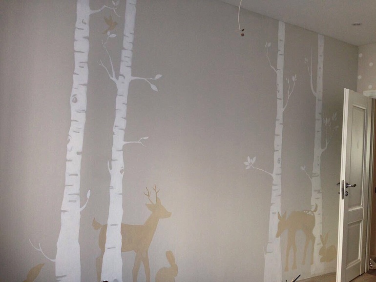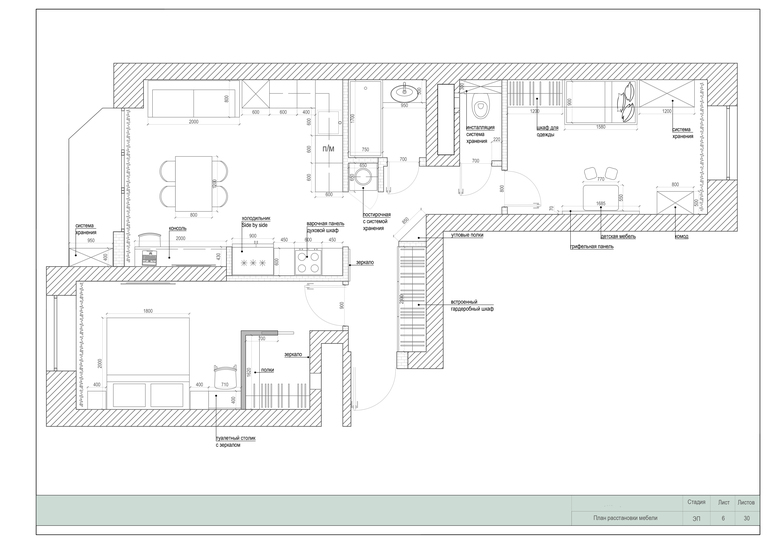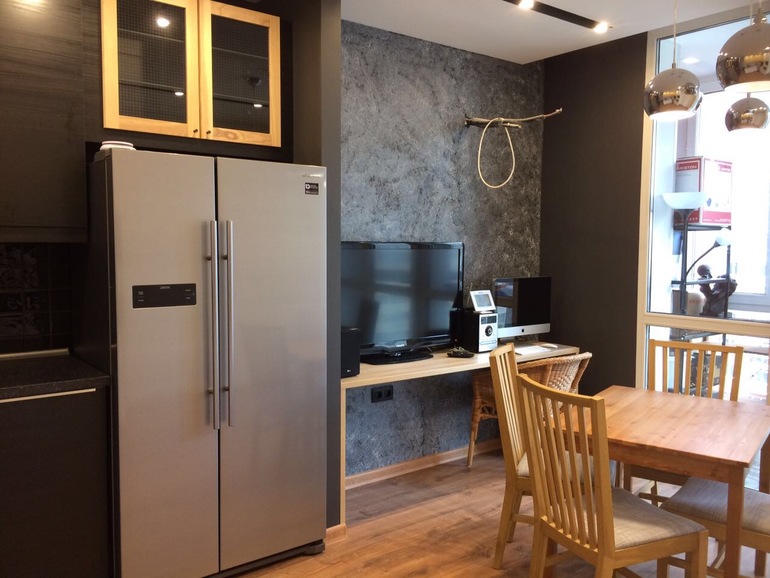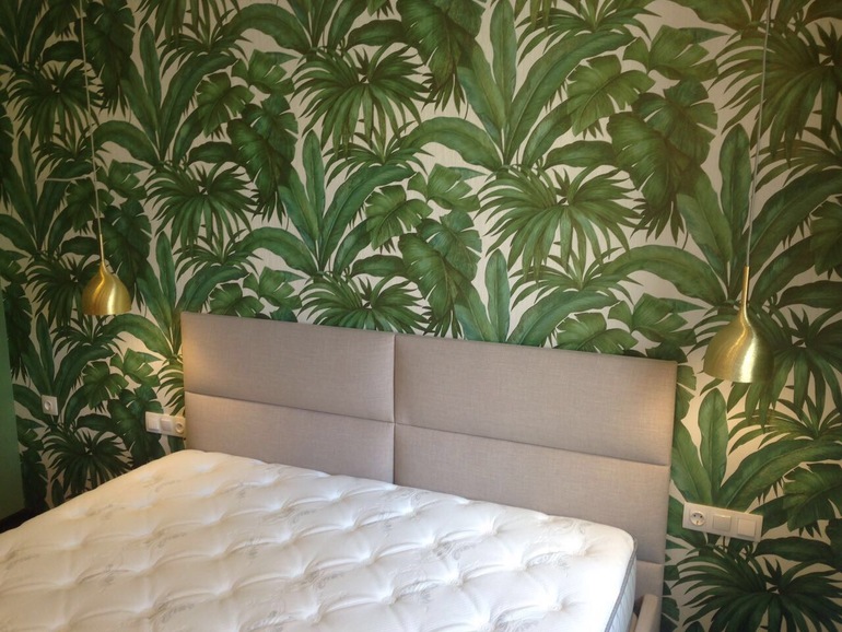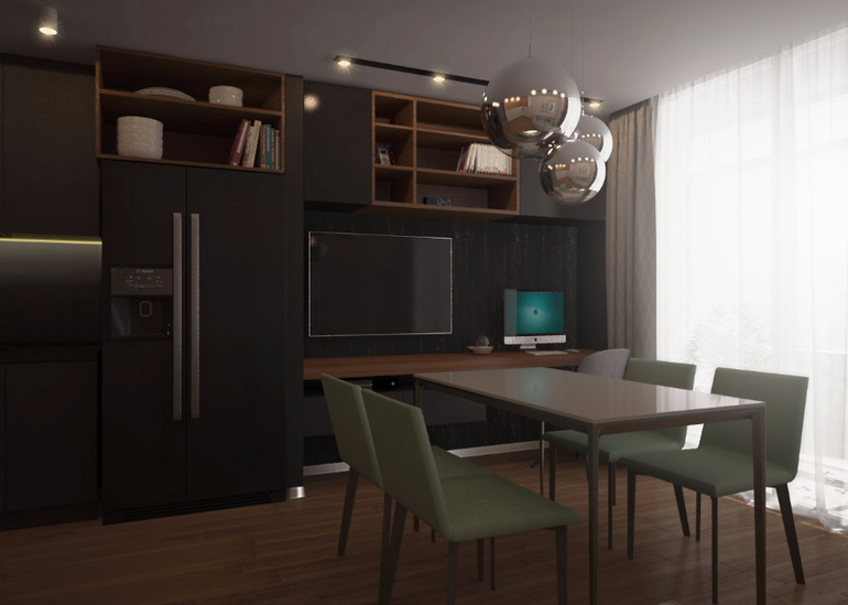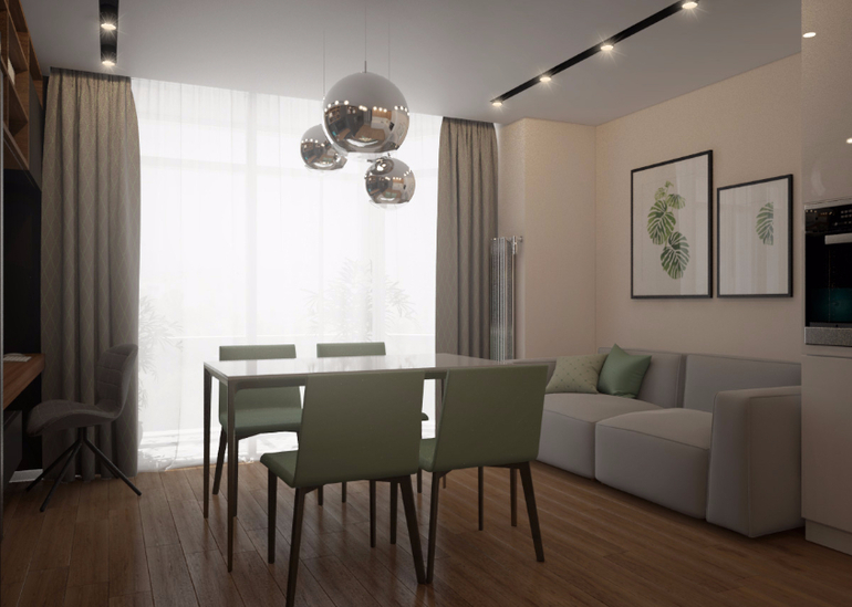 Проект выполнен для молодой семьи с ребенком. Важным пожеланием заказчиков было сделать большую зону для совместного времяпровождения. Так, в основной части квартиры объединились кухня, столовая, гостиная и небольшая рабочая зона. Визуальный эффект зонирования усилен контрастом стен: правую стену мы сделали светлой, а левую тёмной. Большое окно наполнило пространство светом и воздухом. В интерьере спальни создана атмосфера спокойствия и безмятежности. Основой для вдохновения послужили интерьеры тропических бунгало. Текстуры дерева в сочетании с растительным орнаментом гармонично дополнили глубокие оттенки зеленого. Детская решена в нейтральных тонах, главным декоративным элементом является художественная роспись, в которую органично вписывается мебельная композиция.
