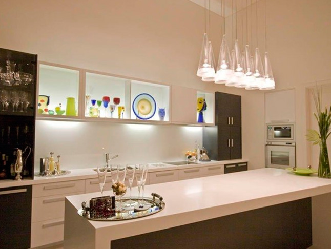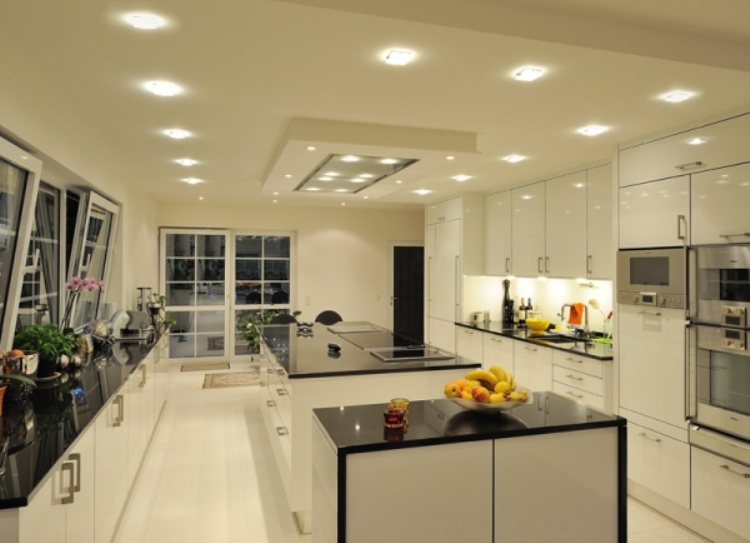 А по периметру кухни потолочные галогенки.