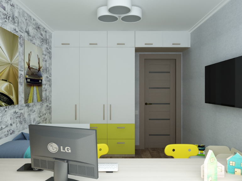 У вас на визуализации детской обои ведь черно-белые, да? почему они не стали придерживаться? мне вот именно эти обои режут глаза. я сама ошиблась в спальне с такими обоями (точнее, муж настоял), но у нас черно-белая гамма, и все-таки она не так режет взгляд.