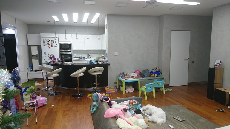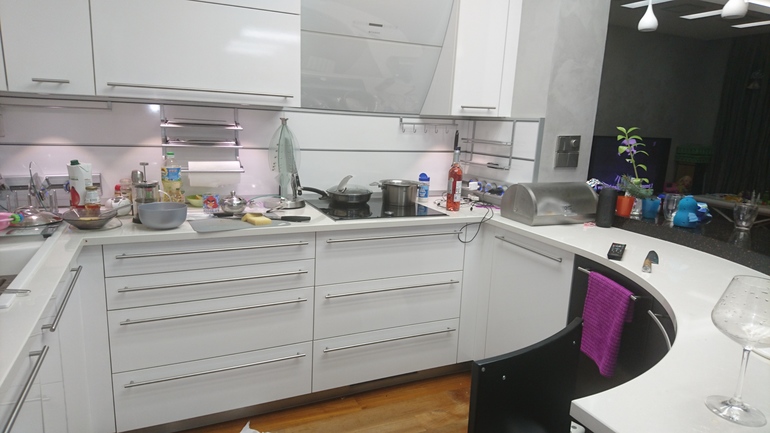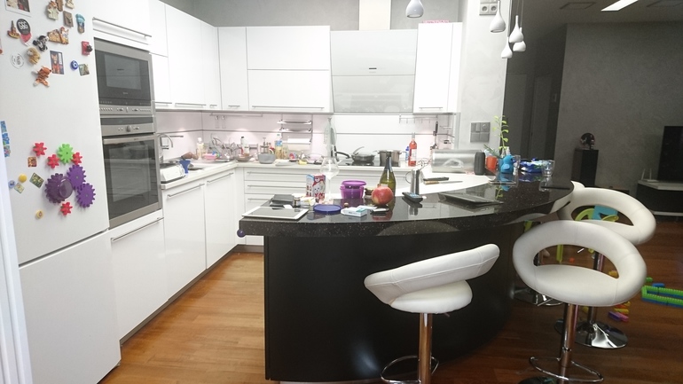 Стол у нас ещё есть обеденный (трансформер и по вертикали и по горизонтали), используется активно, как журнальный и чтоб позавтракать перед телевизором. Но вся тусня происходит за "островом" кухни)) Он оказался очень удобным)). Изготовлен из того же из чего и кухня, кухонщиками. Нижняя столешница, как и столешница кухни из кварца, а верхняя из Кориана - потому что он лёгкий!