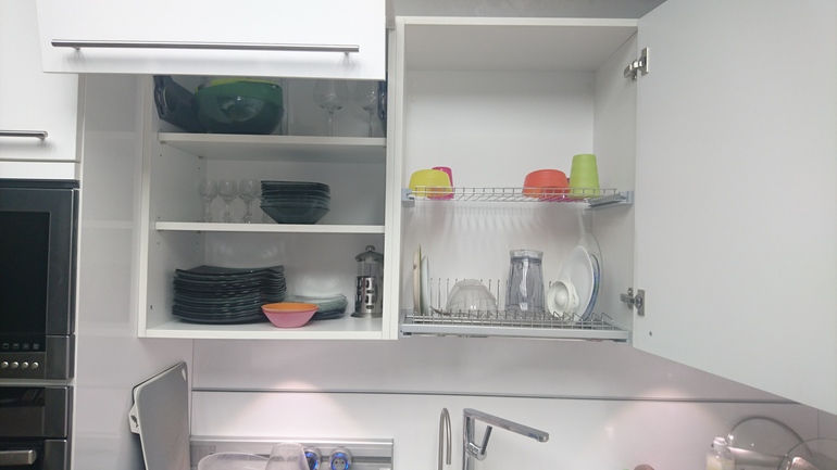 Один шкафчик-сушка, если руками что-то помыть. А в другом хранится посуда, из посудомойки - прям туда.