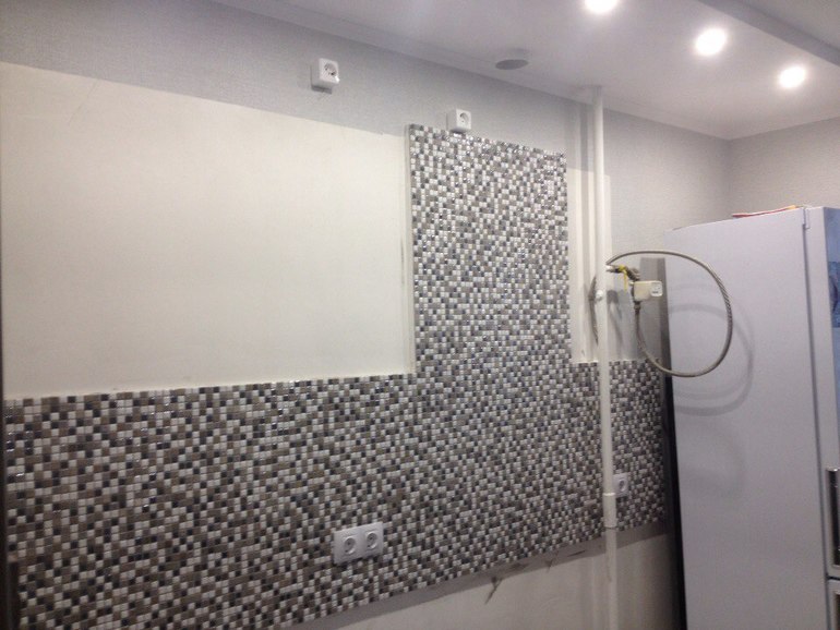 Над холодильником сделали фальш-панель из панелей фасада кухни, чтоб выровнить верхнюю линию.