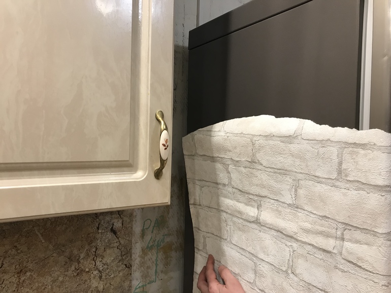 в Вашем случае каменная фактура довольно активно представлена фартуком и столешницей . Кирпичи внесут ещё больше тяжести. Попробуйте разбавить белыми или очень светлыми обоями в мелкий не пестрый рисунок. Который хорошо поддерживается ручками на Вашем гарнитуре. Подобрав текстиль и шторы в тон цветочков или других элементов рисунка на обоях, вы добавите лёгкости и уюта в обстановку. Придерживайтесь светлых пастельных тонов.