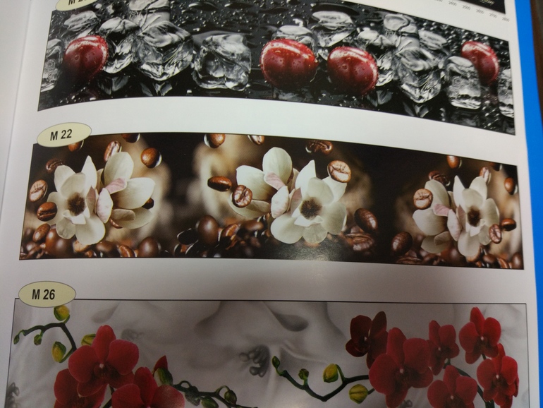 Я бы из стекла однотонный выбрала, рисунки всякие вообще не нравятся. Или плитку, мозаику красивую