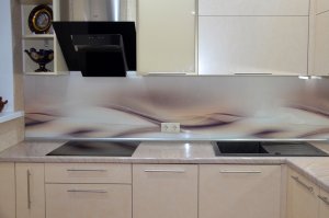 У Вас на стеклах геометрический рисунок. А на фартуке фото цветов. Это никак не компонуется. Оставьте стекла, а на фартук возьмите плитку, всеми здесь любимый кабанчик цвета топленого молока. Он еще хорошо подойдет и к геометрии фасадов.