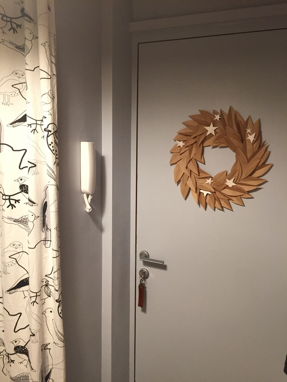 Венок сделала из крафт-бумаги. Благо этого богатства у нас осталось в избытке после мужниного переезда в новый офис. Гуглится туториал по изготовлению такого венка по фразе: "paper bag Christmas wreath" 😊