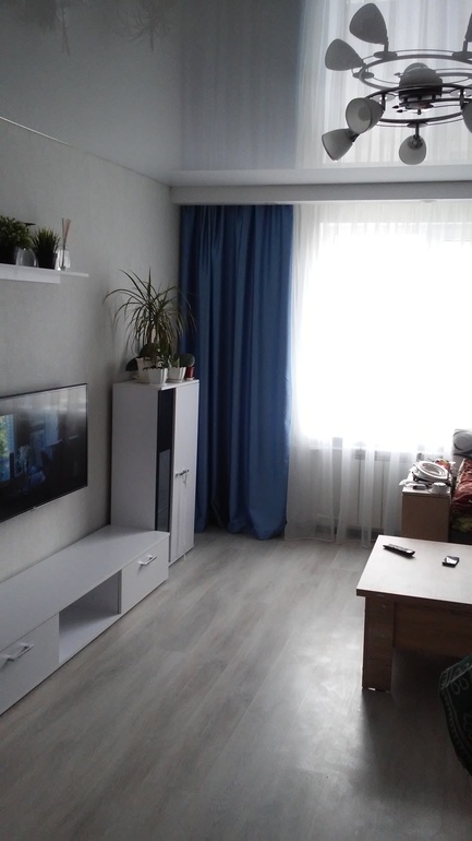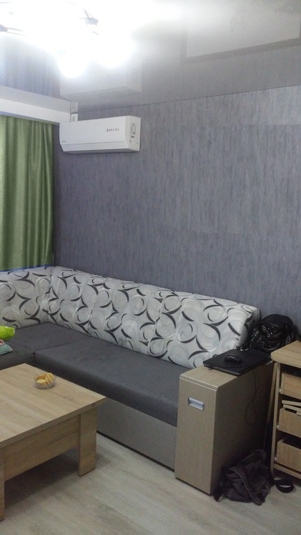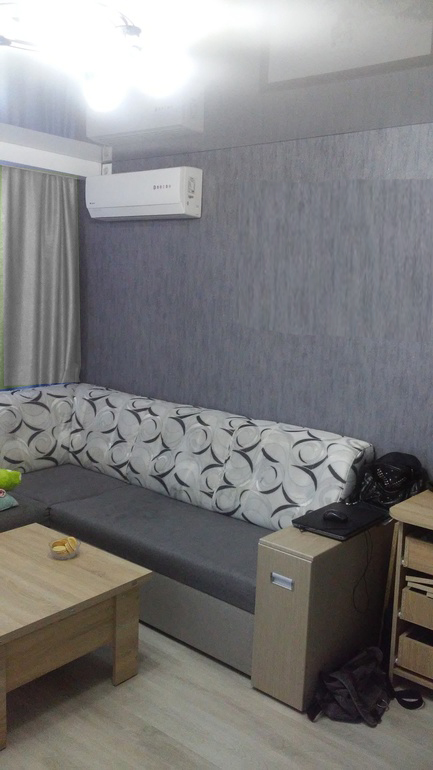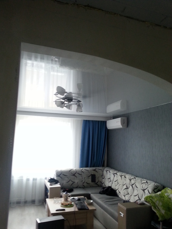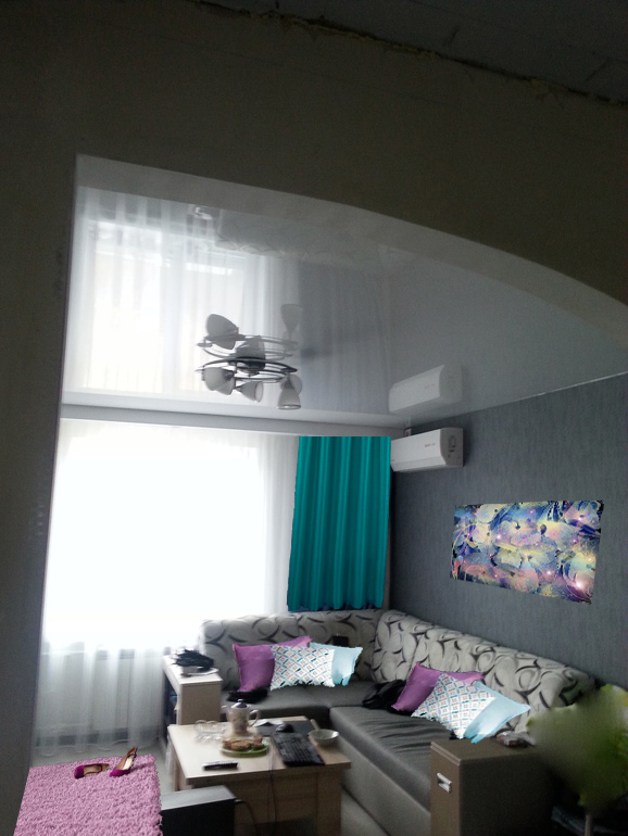 глянцевый потолок - это вынужденная мера, потолки очень низкие, даже нет 2.40, таким образом как бы убрали нависший потолок, теперь его не ощущается совсем. Диван покупали еще даже до ремонта, попался по низкой цене, от него в итоге и плясали. А правее дивана полноценный компьютерный стол. Тоже вынужденная мера. Я не хотела компьютер в гостиной ставить, но муж вечерами в основном за компом и сказал, что тогда совсем видеться не будем, если он будет в другой комнате. А ему спокойнее, когда я рядом