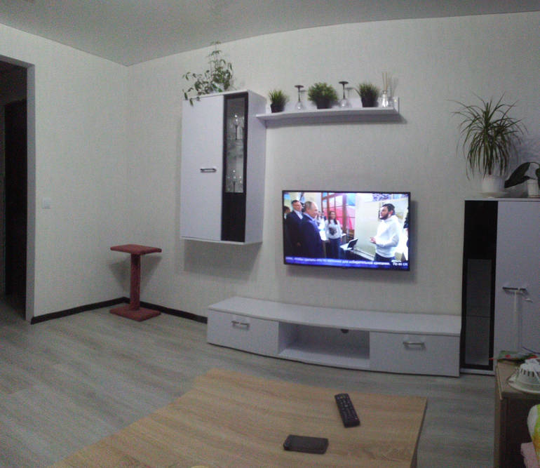 Вот фото с телевизором и фото с диваном как будто вообще из двух разных комнат, где ничего не дружит друг с другом:(