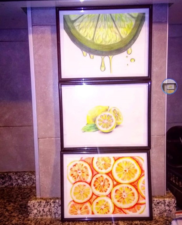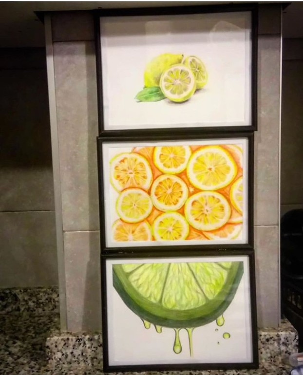 Рисунки классные! В первом варианте заменила бы на крупные лимоны, в пропорции к нижним двум. А в идеале нарисовала бы апельсин и лайм в мелком формате как лимон и сделала бы с широким паспарту. Макро и надоело и мне каж на кухне смотрится лучше мелкий формат. Рамки совсем не нравятся. Правильная рамка может "сделать" невыразительную вещь, а "плохая" наоборот убить классную.