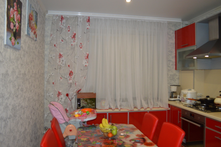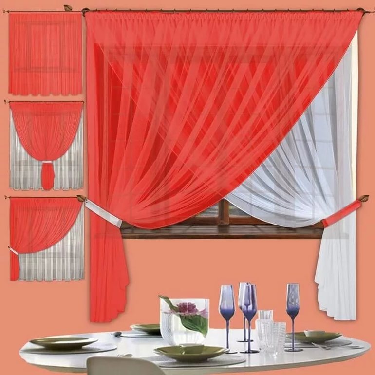 Мебель красная, в активном цвете. Декором окна можно уравновесить. Из цветов оттенки золотистого, шампань, изысканный беж с вышивкой золотистой тоже подойдёт. Сама ткань должна быть воздушной для такой акцентированной красным кухни. Органза наверное не пойдёт, будет нещадно блестеть. Сетка французская может, тюль, тонкий-претонкий лён, кружево - что-то невесомое и «дырявчатое».