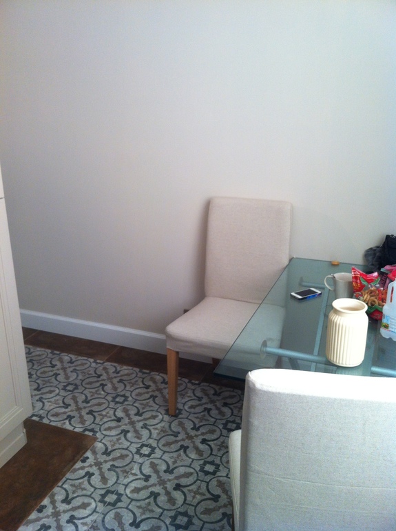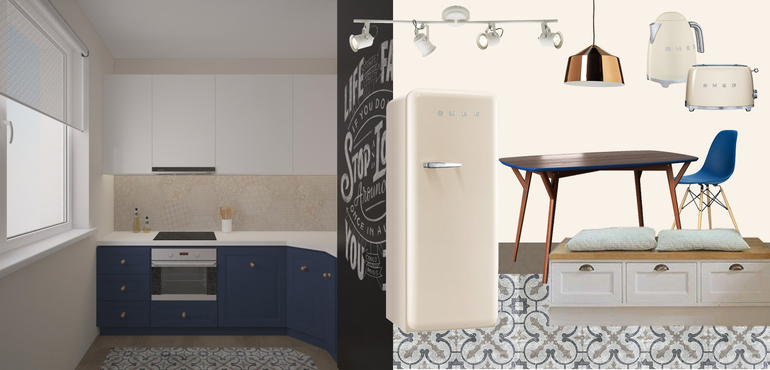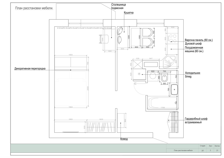 На плане всё довольно просто, по итогу изменили положение дивана, холодильник решили сделать встроенным и на кухне остановили на столе со стульями