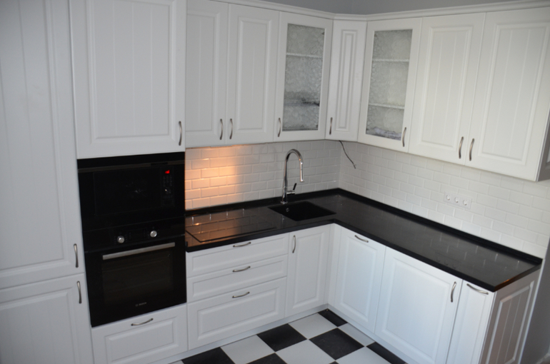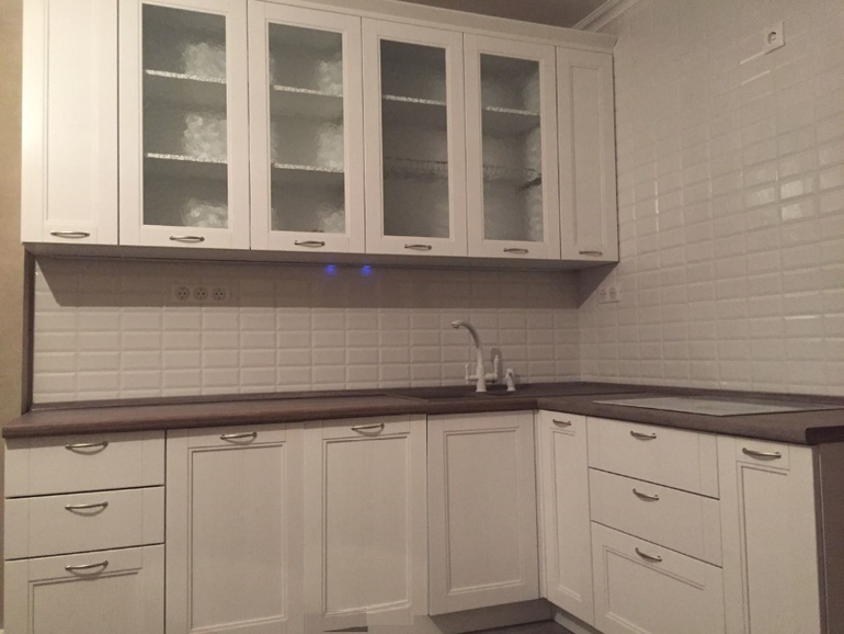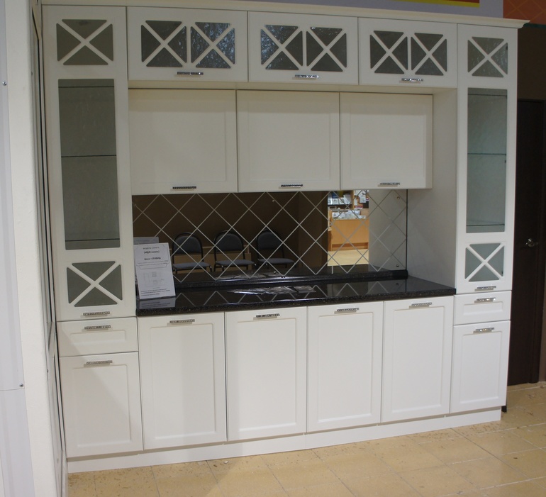 1.Модель Соната-Эмаль матовая белая, стиль прованс, ящики с доводчиками, столешница влагостойкий ламинат, в подарок стеновая панель зеркало.Длина 3м, .Цена =55000р