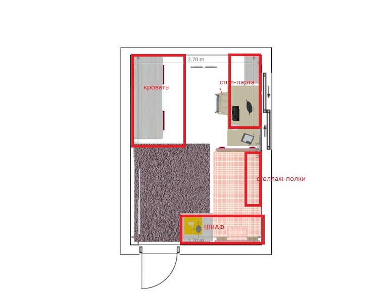 Хочется помечтать, какой же будет наша квартира, когда будет куплена/сделана новая мебель, и расставлена по своим местам. Начну с дочкиной комнаты. Изначальный вариант мужа: кровать в левом верхнем углу, письменный стол под окном, справа от двери шкаф. Мне не нравится положение кровати, получается ребёнок будет спать "вперёд ногами". Поменяли кровать со шкафом местами, получилось вот что: