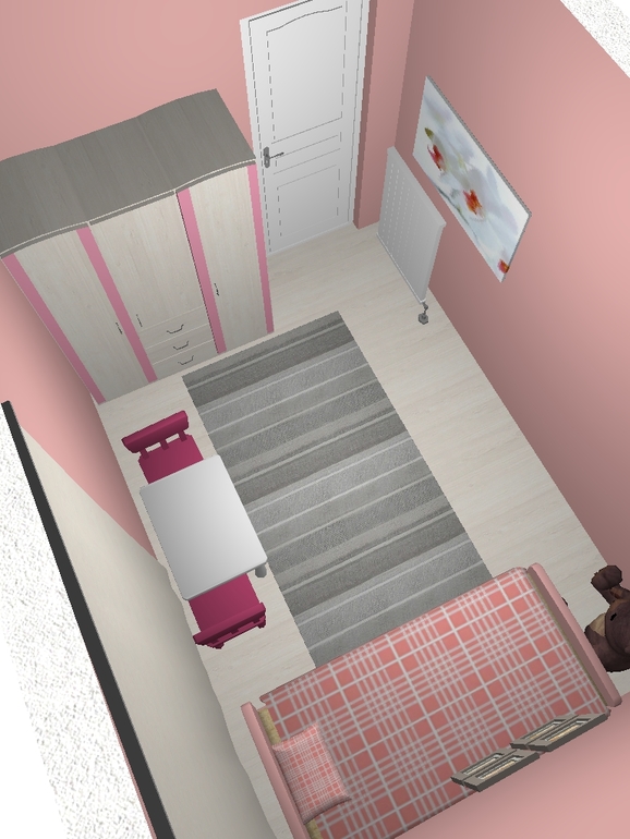 P.S. Визуализацию делала впервые в жизни, и не до конца разобралась с программой, прошу не судить строго. Всем спасибо за мнения! А, и стены покрашены примерно в такой цвет, бежево-розовый. Может стоит поменять его? И какого цвета мебель видится? Мне представлялась молочного, или в цвет ламината.