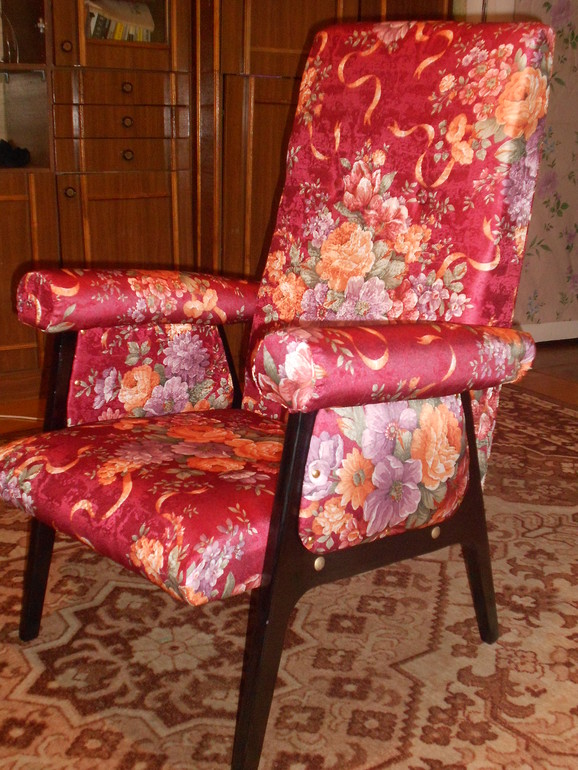 Не могу не восхититься уровнем профессионализма:) но, по-моему, кресло без усовершенствований выглядело гораздо более стильно, я бы не стала вносить изменений в конструктив, заменила бы ткань на однотонную или очень приглушенную в исходной гамме, а деревянную раму осветлила. Тогда советское кресло превратилось бы в лаконичное сканди:)