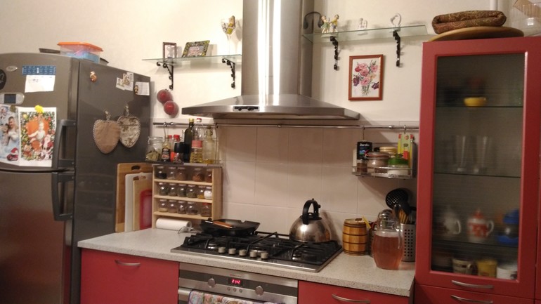 Шкаф высокий 2 метра и все туда. Конфигурация кухни самой позволяет такое. Она не прямоугольная,а как раз с выступом под него