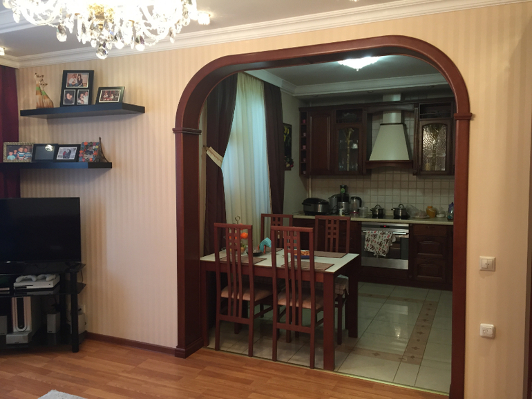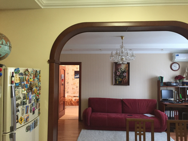 10 лет назад делали ремонт и родители мужа удружили пока нас не было (жили в другом городе) все решили, сделали и узаконили за нас... хотя мы были против. Ладно что имеем то имеем, поначалу все устраивало, маленькие дети в зале, я готовлю на кухне все под присмотром. Сейчас в комнате хочу сделать что то новое, новые обои светлые, эти уже выгорели, как то обновить, мебель поставить по другому, и в связи с этим поднялся вопрос а не убрать ли нам арку, возвести стену и огородить кухню от комнаты, на кухню поставить дверь купе раздвижную, и сделать наконец то 2 разные зоны, коль уже начинаем весной ремонт. И вот думаю стоит или нет? я написала что меня не утраивает в таком объединении, и что устраивает. Фото снизу.