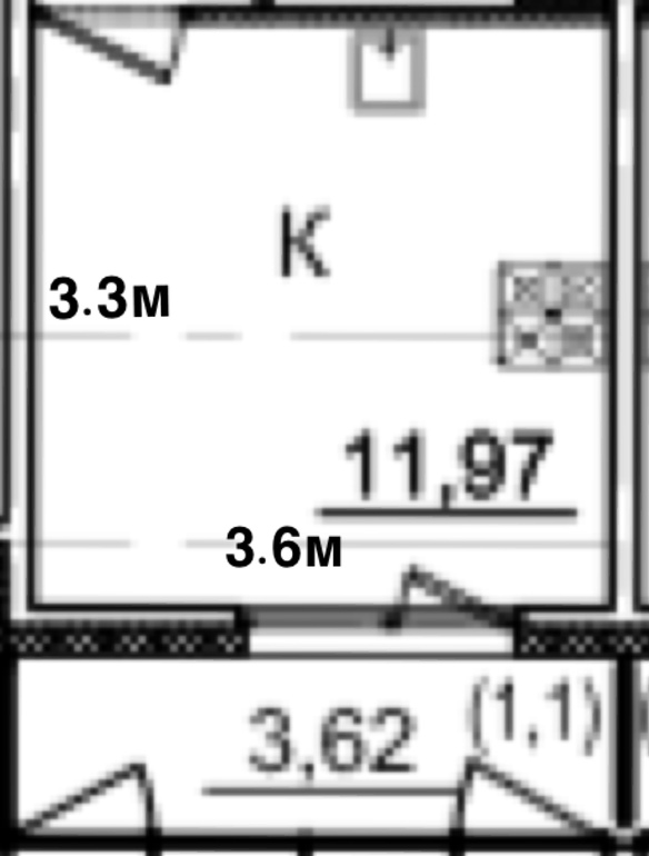 У нас 12 м, по длинной стороне по середине окно двухстворчатое, углом гарнитур, вдоль Окна стол, на короткой стороне телевизор очень большой - раньше был в зале в другой квартире. Под ним детская кухня и стул для кормления. У нас огромный плюс - нет проема двери, кухня продолжается коридором достаточно широким под прямым углом. За счёт этого просторно