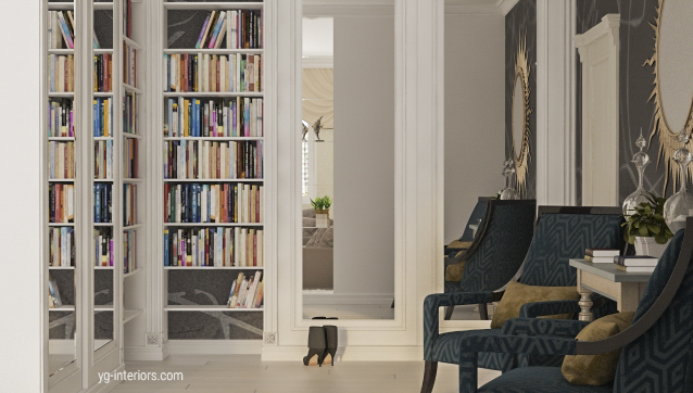 В одном из проектов заказчики попросили сделать в большой прихожей библиотеку.
