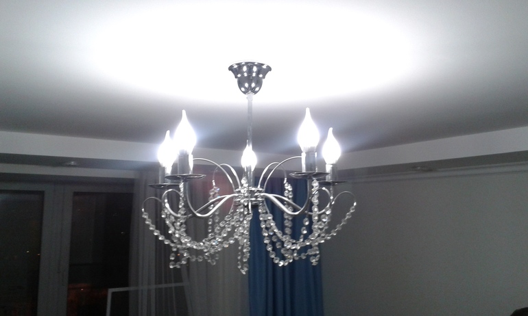 Симпатичная люстра, легко смотрится, не массивная. Можно узнать, у вас потолок крашенный или натяжной?
