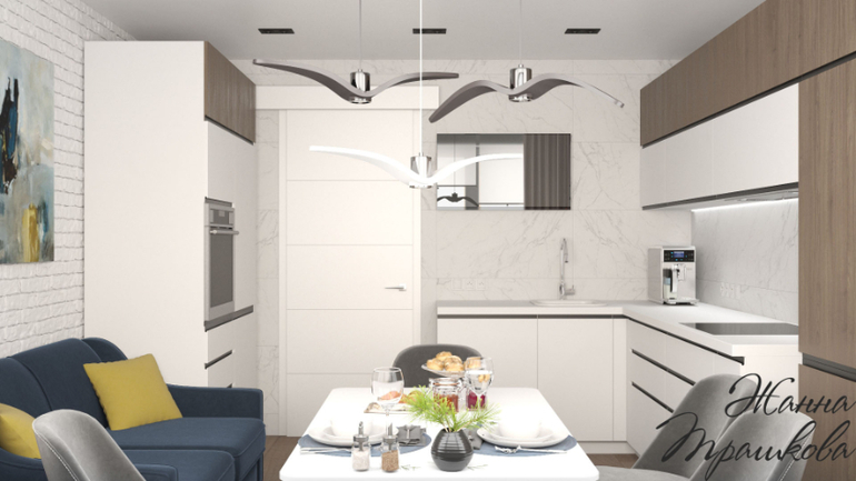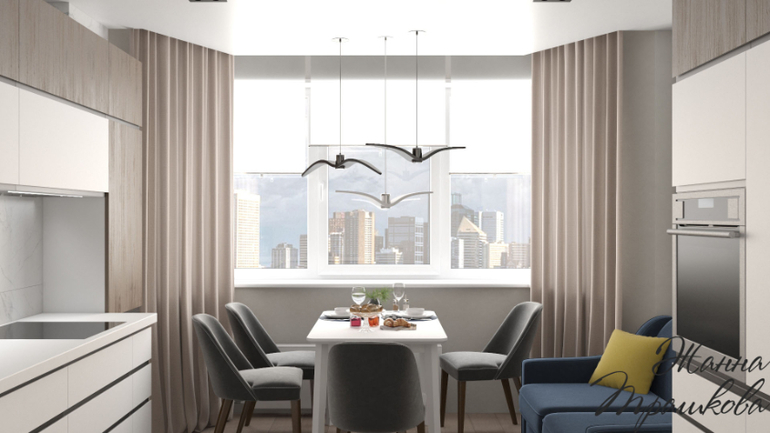 Здесь хотелось получить интерьер лаконичный, но в тоже время элегантный, функциональный.