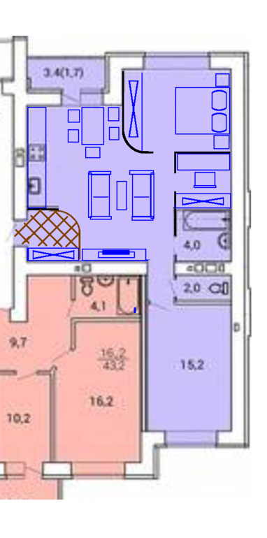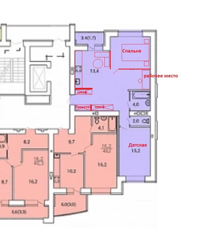 Вопросы и ответыПомогите, пожалуйста, распланировать пространство. Двушка 70 кв.м. - синяя, крайняя справ. Нужно спальню, детскую, кухню гостиную и обязательно рабочее место, но не в спальнях и не на лоджии.