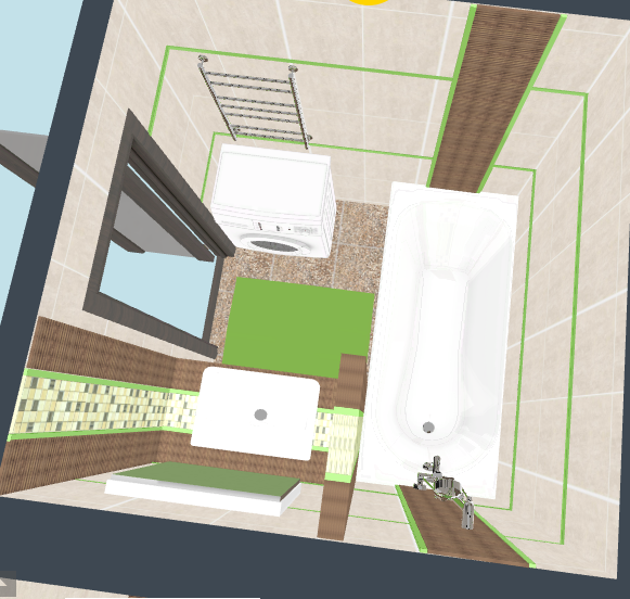 Наличник двери будет плотно прилегать к бамбуковой плитке, поэтому зазора не будет, как на эскизе. И думаю еще за зеркалом-шкафом все-таки не использовать продолжение зеленого бордюра, оставить стену просто в плитке, зеркало будет 85 шириной и высотой 60, поэтрму зеленый бордюр особо виден не будет, а деньги на него потратятся.