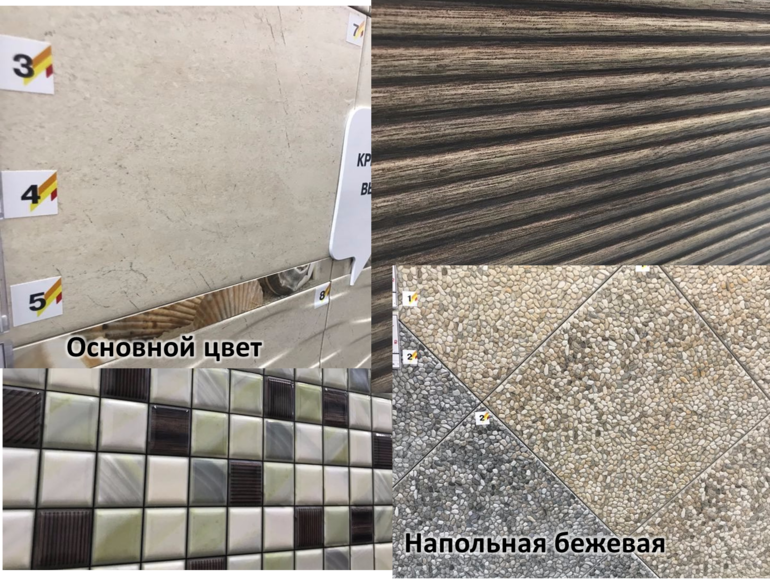 Плитка по текстурам будет такая - большая часть матовая, за исключением зеленого стеклянного бордюра (он не зафотографирован, ширина 2 см) и мозайки.