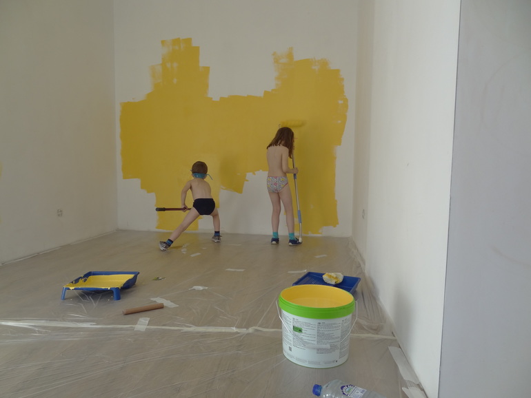 а мы сделали там где кровати и где стена для телевизора с комодом,будут жалюзи еще желтые, ну и часть стола желтая