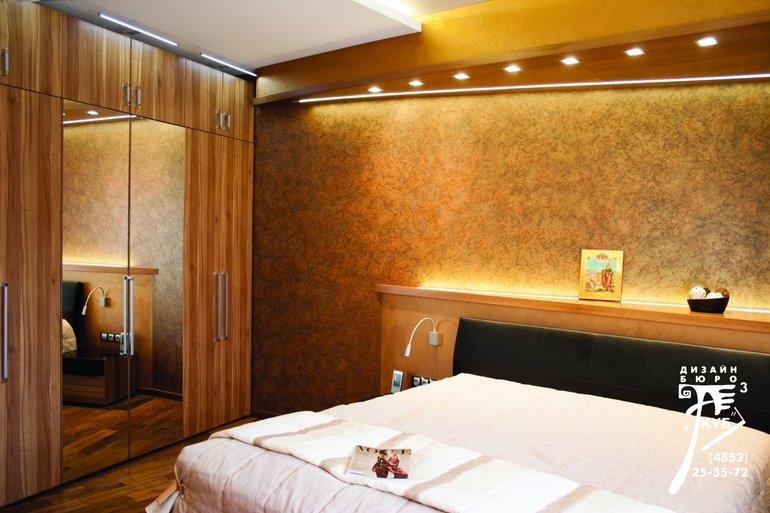 Спальня - это рискованный проект был, т.к. вся квартира светлая и здесь дизайнеры предложили рискнуть и сделать её темнее намного. Я боялась, но вышло очень хорошо.