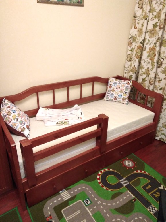 У меня только на работе вот такое фото, что называется, без прикрас - это сразу после сборки. Они, кстати, покрасили ее в итальянский орех, как я просил - этого цвета не было в палитре детских кроваток.