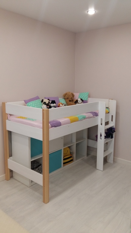 Это этажерка отделяет спальные места от детской и там стандартные ящики из икеи помещаются. Между кроватями и полками бельевой ящик. Я на нем сижу, укладываю спать, читаю, пою.