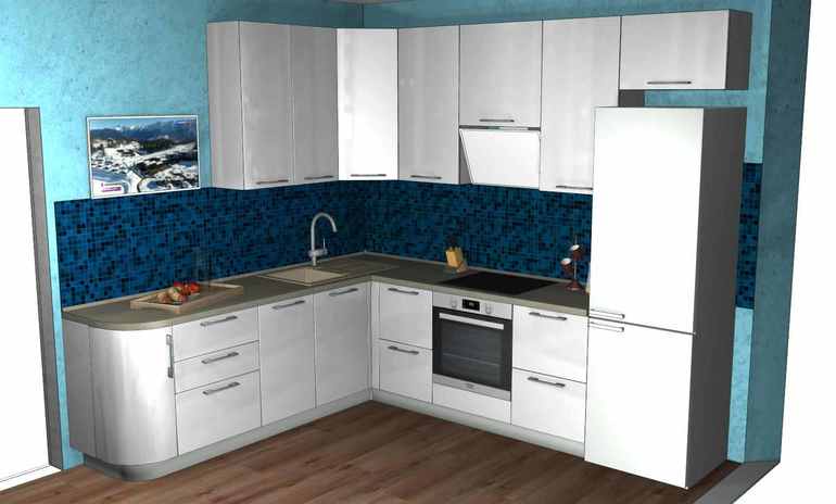 Хороший размер кухни. И не большая, и места хранения есть. Мне нравится проект. Большие ящики возле варочной, для столовых приборов возле мойки и основной рабочей поверхности. Я бы не делала закругленный шкафчик (без толку пропадает место), а расширила ящик рядом с ПММ. К углам быстро привыкаешь. И спорный верхний угловой шкаф. Если низ под 90 градусов, то и верх лучше сделать так же.