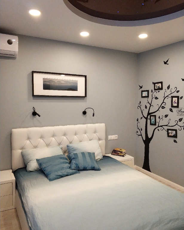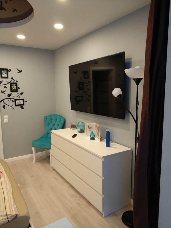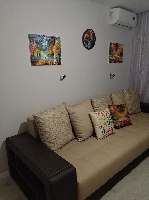 Итак вот она. Планировалось что тут будет жить мама, купила диван себе, но пока комната пустует и является гостевой. Пока не нашла бра и люстру которые мне понравятся (поэтому тут очень темно)