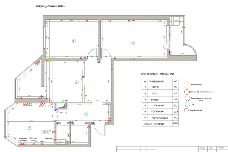 Сначала мы нашли электриков и полностью переделали проводку. Я брала схему квартиры и рисовала где и какие должны быть выключатели, розетки и светильники. У нас в коридоре проходные выключатели у каждой комнаты. И в спальне возле кровати.