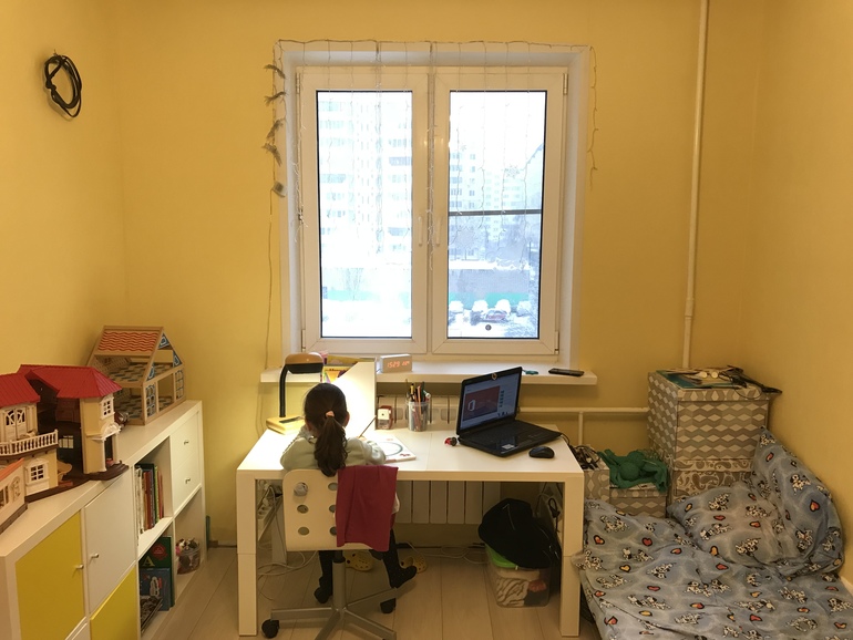 Мы по бокам от стола поставили стеллажи для всяких нужностей, на окнах рулонные шторы день /ночь. Простые шторы или даже просто тюль считаю лишним, тем более, комнатка у вас маленькая, место надо использовать по максимуму
