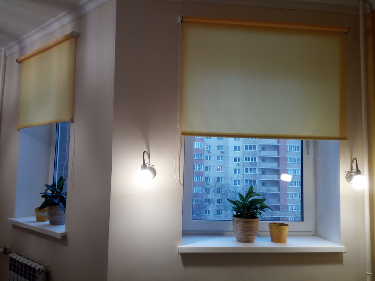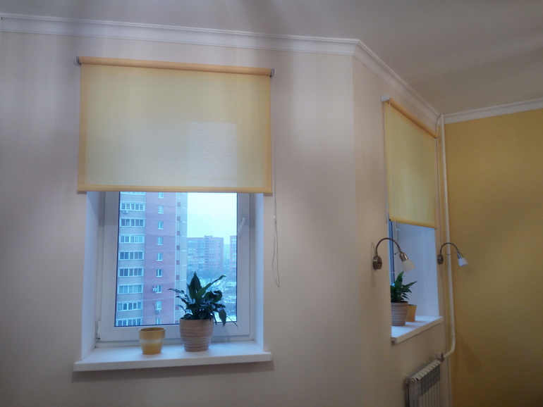 У нас на окнах рулонные шторы, под цвет обоев и легкая тюль.