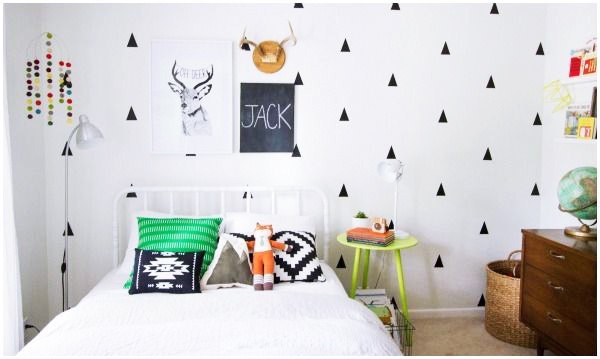 Интерьерное решение детской комнатыПоклеили светло серые однотонные обои , почти белые , теперь хочу одну стену задекорировать наклейками с али , смотрю на всех картинках с дизайном , акцентная стена , та , вдоль которой стоит кровать , а я хотела сделать напротив кровати , так как она самая свободная будет , кровать домик , высокая , а на против стена будет практически пустая . Теперь сомневаюсь . Как думаете ? И не могу определиться с наклейками , безумно нравятся листья , но не уверенна что для детской подойдет , треугольники тоже нравятся