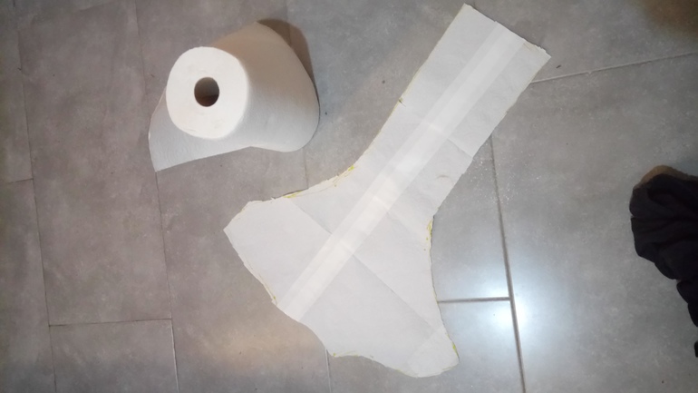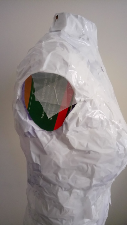 Заклеиваем тем же скотчем разрез, вырезаем картон для отверстий рук и шеи, заклеиваем скотчем: