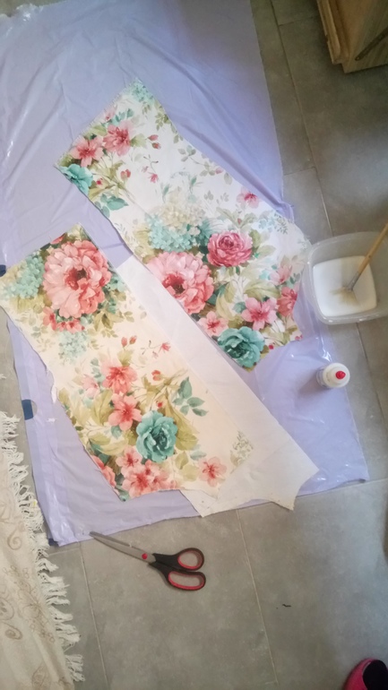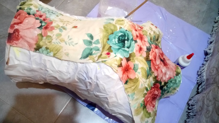 Вырезала из ткани деталь, соблюдая рисунок (цельный, по центру или просто красивое место узора) и начала приклеивать ее на манекен, используя клей ПВА пополам с водой: