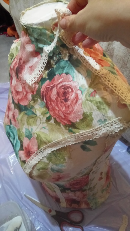 В конце оформила стыки кружевным кантом, приклеив его поверх скоб степлера.