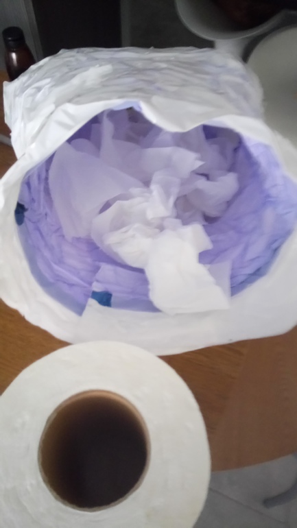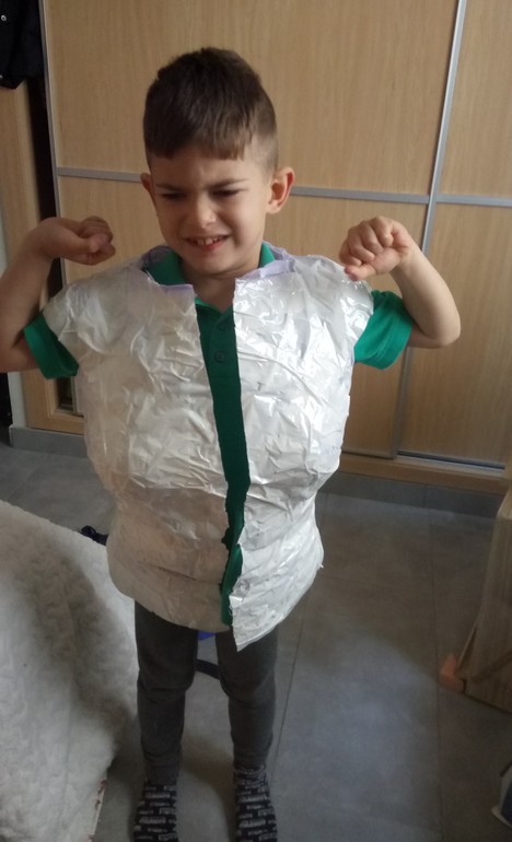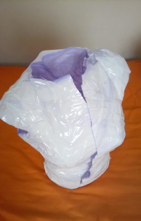 Заклеив всю поверхность пакета в несколько слоев, разрезаем его от пояса до шеи. В интернете показан разрез на спине, я не рискнула доверить это сыну😳 и сама разрезала спереди, на результате это не сказалось:
