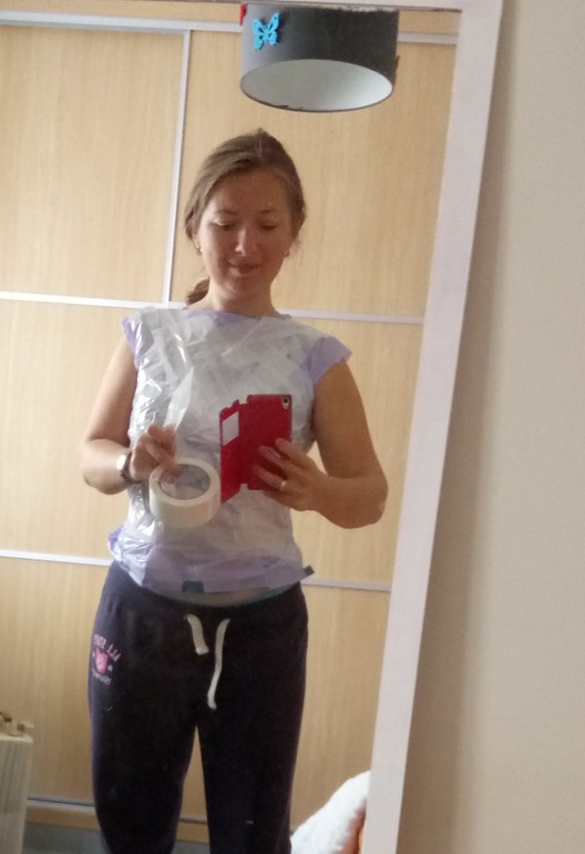 Продолжаем отрезать недлинные полоски и обклеивать торс со всех сторон. Лучше это делать по диагонали, не перетягивая тело (почитала, девочки так утягиваются, что чуть в обморок не падают, это лишнее))
