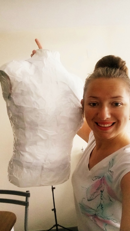 Шью я крайне плохо, вдобавок моя машинка вместе с мебелью ждет переезда в другом месте. Подумав, решила обить манекен с помощью степлера и клея))