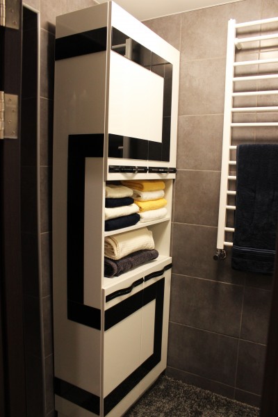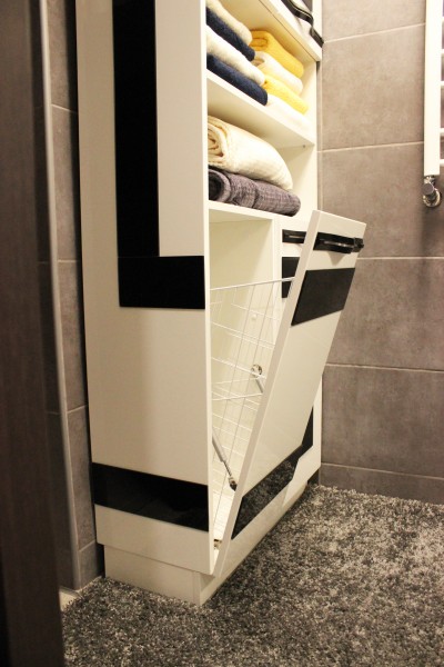 Мы делали такой проект для черно-белой ванной: белый глянец + акценты из чёрного стекла lakobel
