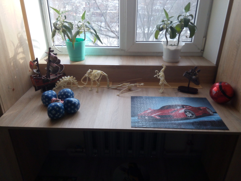 У нас столешница подоконник. Сначала был вровень, но потом опустили, тк. высоковато. Вот как это выглядит. Но сын все равно играет, рисует, занимается пока на полу или маленьком столике, поэтому в плане удобства пока не скажу.