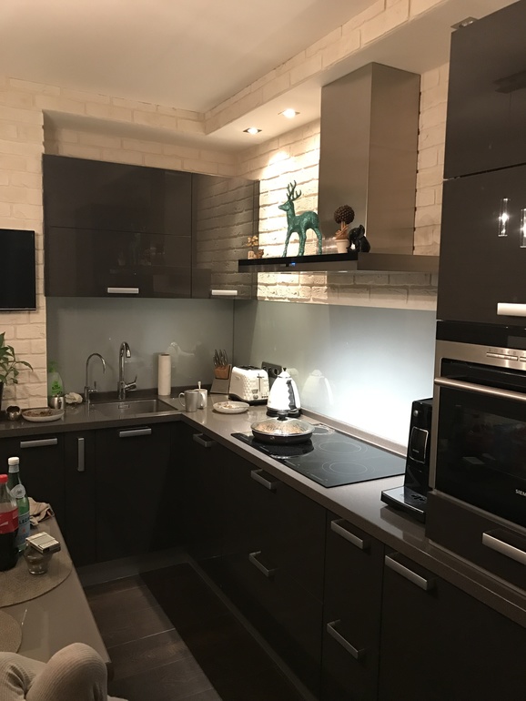 Как вариант, можно так сделать. Кухня моей подруги. У неё стекло вместо фартука. Все стены кирпич. У меня фартук и выше за вытяжкой плитка, в дневнике есть фото.