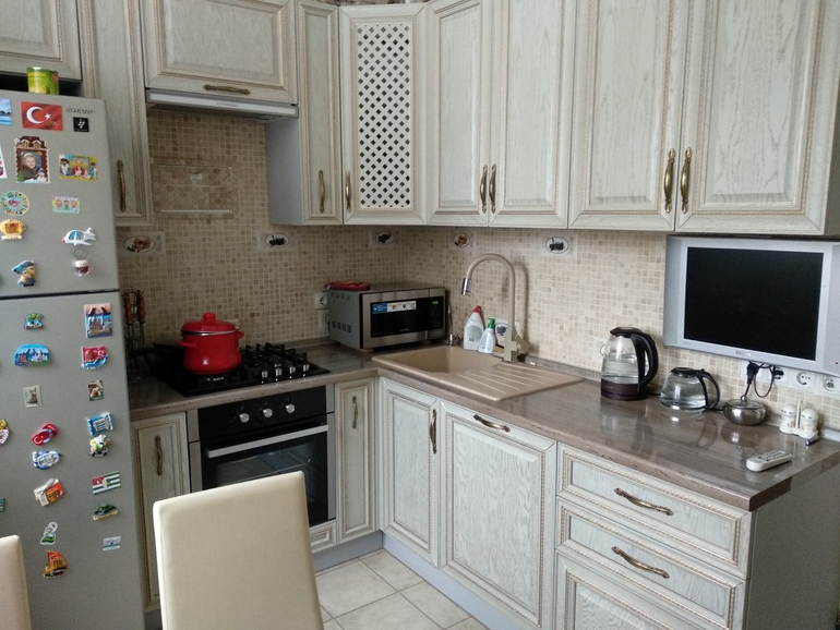 У нас примерно так же, как у вас, только чуть поменьше кухня. Холодильник не с двумя дверьми, но тоже здоровый. По другому у нас никак, если холодильник на другую стену, тогда стол не влезет.