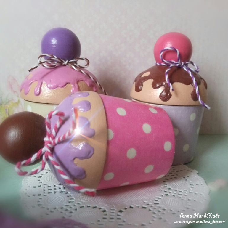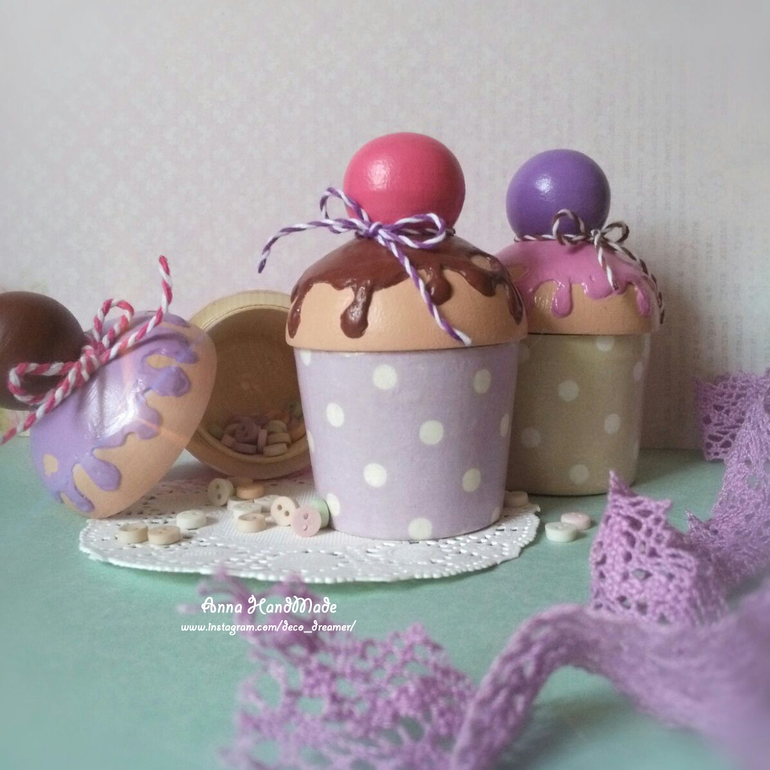 Интерьерные штучки.Давненько я не показывалась в сообществе:), привет всем ценителям прекрасного! Хочу похвастать новым своим декором для детской: шкатулочки-капкейки, могут хранить в своих недрах много маленьких секретиков, а могут стать декором-угощением для гостей на игрушечной кухне.